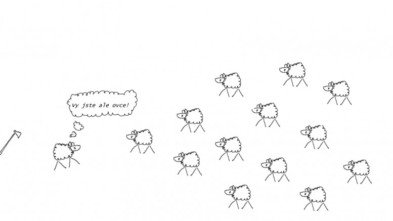 Všechno je sice jinak. Ale to, že jsem byl ovcí, neznamená, že vím, kdo je ovčácký pes. To, že vím, kdo je ovčácký pes, neznamená, že vím, kdo je pastýř. To, že mám potuchu o postupech pastýře, neznamená, že vím, kdo pastýřem je. To, že vím, kdo je pastýř, neznamená, že vím, kdo je král a jaké jsou jeho skutečné záměry. To, že se domnívám, že nad králem jsou nějaké další struktury, neznamená, že jsem přestal být ovcí a vím, kdo je kozel. Třebaže mám vlnu méně ostříhanou než mé „spící“ kolegyně.